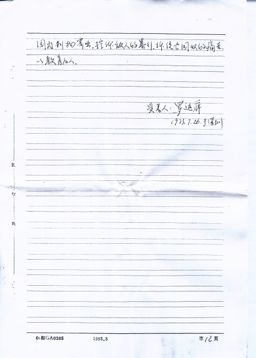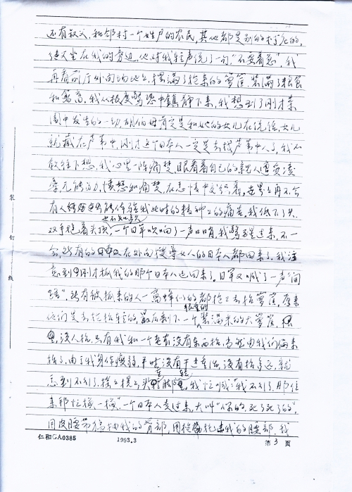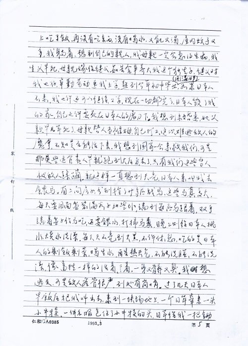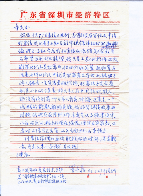 I’ve received your letter of the 17th. Thank you for taking the time to write to me. I was concerned about not knowing the address and postal code of the Japanese Embassy in China. Now that you’ve told me, I can send my letters and send other materials directly to it. Though I don’t expect to get any compensation; I will never stop accusing them of the war crimes. They may not be criminals themselves, but their parents and uncles may still be alive, and they may be the children of the criminals. If I can make the Embassy convey the accusation from victims like me, the conscience of their deeds will bear on these criminals. So many Japanese soldiers have killed and raped in China, but we haven’t heard a single one of them acknowledging or confessing to what they did. How cruel the Japanese people are! I will keep collecting materials. Right now, I work on bridge design in Shenzhen. After I return to Wuhan in the future, I will devote myself to telling the crimes of the invading Japanese army and will use my own money to get the truth out if necessary.