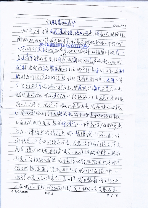 I never saw Yin after that. The scene of his beating removed any idea of escaping for me, but I couldn’t take it anymore. I was getting thinner and thinner. Every day, I dragged my legs to work. If I took a rest, I would be beaten. My wound on the leg began to fester. I was in so much pain. I thought I might die there. One day after the Japanese had dinner, the traitor came. Sometimes, he wasn’t in the house, so I didn’t see him much. He asked me to clean up the table. This was the first time that I was allowed to enter the place where the Japanese took a rest. My place was the stable and bath room. The traitor said that and left. There were several houses between the room I was kept in and the place where the Japanese had meals. It was dark then. It suddenly occurred to me that it was my chance to run away. I checked the place at daylight. Opposite to the houses was a mountain. There was a small path leading to the terraces and then the mountain. I walked out of the side door and saw nobody outside. So, I ran towards the small path. The distance was not long, but it seemed I couldn’t finish it. My legs trembled and I fell over several times, but I got up and kept running. Finally, I ran up the mountain, looked back and saw no one was after me. The Japanese might haven’t noticed me missing yet. Luckily, I wasn’t caught. I gradually walked forward in the dark. The sky was dotted with stars and there was no moon. It was quiet without chicken crowing or dogs barking because they were all eaten by the Japanese army. I walked in the black mountain alone, fearing not ghosts but the living Japanese soldiers suddenly popping up. At midnight, I saw light from a house in front, but heard a Japanese shouting. So I turned around and walked backwards. At dawn, I couldn’t walk anymore because I was afraid that I was still in the area of the stationed Japanese army. The place was hilly, with few trees, so I had to hide in the rice field. It hadn’t rained for a long time. The field was dry and no one came to harvest the rice. I ate millet when I was hungry. The sun was so strong that I could barely breathe. I hid still, listening to the surrounding sound. When it was dark again, I climbed up and kept walking forward. I stumbled all the way through the night. I stopped and continued and reached a hill before dawn. Through the thin mist, I saw a half-naked Japanese soldier sitting under the hill with back towards me. I broke out in a sweat, quickly squatted down and walked backwards quietly, with eyes staring at the back of the soldier. Luckily, he didn’t notice me. I quickly ran away from the place. I had to be more careful because I was still in the area of the stationed Japanese army. I tried to avoid the houses and big roads. The mountain had many trees and grass. I could secretly move forward in the daylight. In the afternoon, I walked before a big road and must cross it to reach the other side of the mountain. I observed for a long time and didn’t see anyone on the road. So, I hurried to cross the road. Unexpectedly, someone walked out from the other side of the road, about 100 meters away from me. He shouted, “You shouldn’t run away.” I was surprised and looked over. What a small world! It was the traitor. But there were no Japanese soldiers behind him. I strode over the road, jumped in the bushes and ran like hell. I reached a cliff about 7 meters high and under it was sand. I hastily jumped down and felt much pain at my knee when I landed on the sand. I could hardly stand up. But fearing the enemies may come after me, I kept walking. At dusk, I could see many people harvesting rice in the field. I finally got away from the enemies. I felt so happy. I walked towards them and explained my experience. With their help, I walked all night and returned to my home the next day. The family cried when seeing my ghostly appearance. My mother was sick in the bed and couldn’t get treatment due to the lack of money. But after I came back, she gradually recovered. My skin disease was cured and I gradually got to know what happened after I was taken away. On the day I was captured, the villagers hiding in the dark saw me carrying a basket in difficulty. They said to each other, “He was weak and honest. He could never come back alive.” It was all the fault of the evil Mrs. Liu who shouted “The Japanese had left.” to lure us out. Now, she spread rumors of my bride-to-be being violated by the Japanese. My bride-to-be told me with tears what happened that day. She was first knocked out by the Japanese soldier and then raped. She wanted to kill herself and was saved by her mother. Later, I forgave her and married her, but her misfortune didn’t stop. She got ill from all the anxiety and died two years later. Her mother married a farmer and also died before long. During the days of Hengyang’s fall, we lived in poverty. My stepfather ran a fish business before he was taken away and my mother fed pigs at home. They worked hard to put me through school. But now all was robbed. We had to live on credit and nearly begged to live in the street. After Japan surrendered in 1945, I couldn’t depend on my parents anymore, so I settled in Hengyang City. My mother died early. At her death bed, she grabbed my hand and shouted, “The Japanese are coming. Go.” The Japanese ruined my family and my life. I have a constant pain in my chest, waist and joints from the beatings. My mental trauma cannot be cured. I suffer from a serious neurological disorder and insomnia. I often have nightmares of being captured by the Japanese army. The humiliation my wife suffered comes to my mind from time to time. This is a burning shame of my life I will never forget. It torments my spirit constantly. Although I didn’t die under the Japanese’s hands, they shackled my body with a chain and whipped my mind with a belt. Revenge might ease my pain, but it is not likely. If a curse can kill them, I will do t