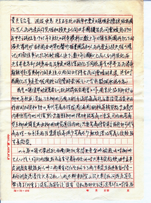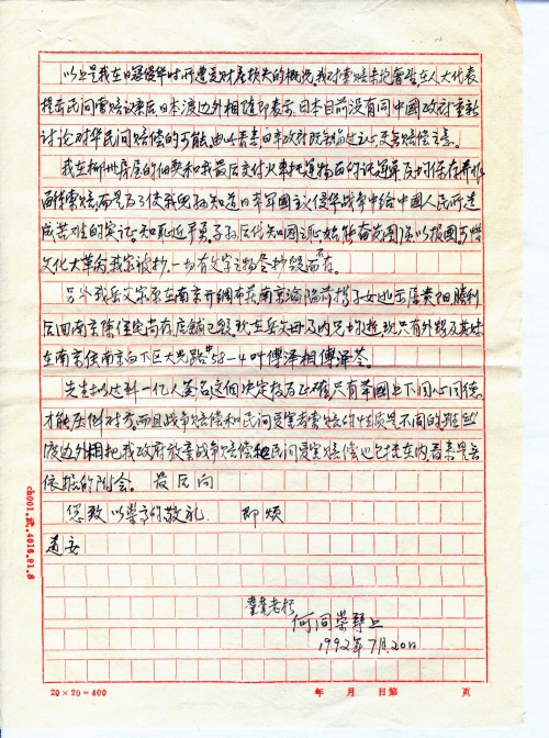 阅报,欣悉先生为在抗日战争中遭受日寇烧杀掳掠,给我国亿万人民所造成的灾难和损失,拟向日本国提出民间索赔。自1894年甲午之战始至1945年8月抗日战争胜利止,数十年日寇在我国所犯下的滔天罪行,旷古未闻,世所罕见,罄竹难书。国家和人民所遭受之损失难以胜[计]。回顾往事,记忆犹新,催人泪下!数十年之国耻已为人们所淡化,而先生并未忘却,挺身而出,为深受日寇之害的亿万同胞,奔走呼号,为民请命,期能引起有关部门的关注,从而向日方提出民间索赔的交涉。先生对我国亿万身受苦难同胞之同情的赤诚之心,令我敬佩,永志不忘!
