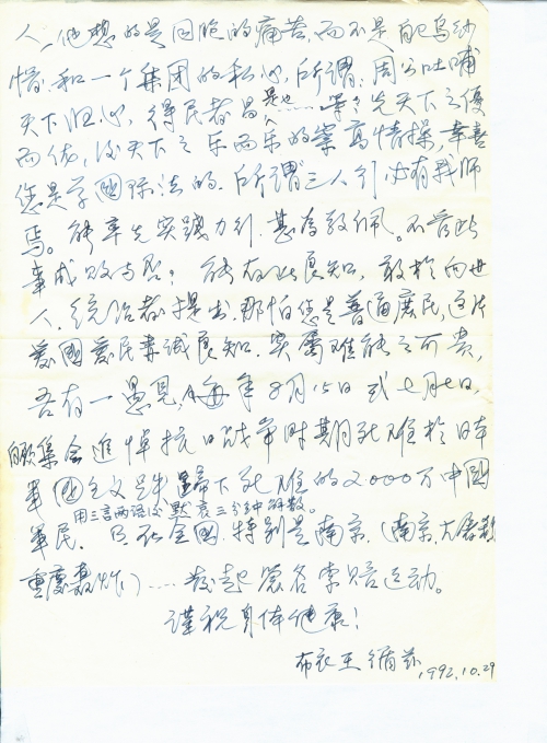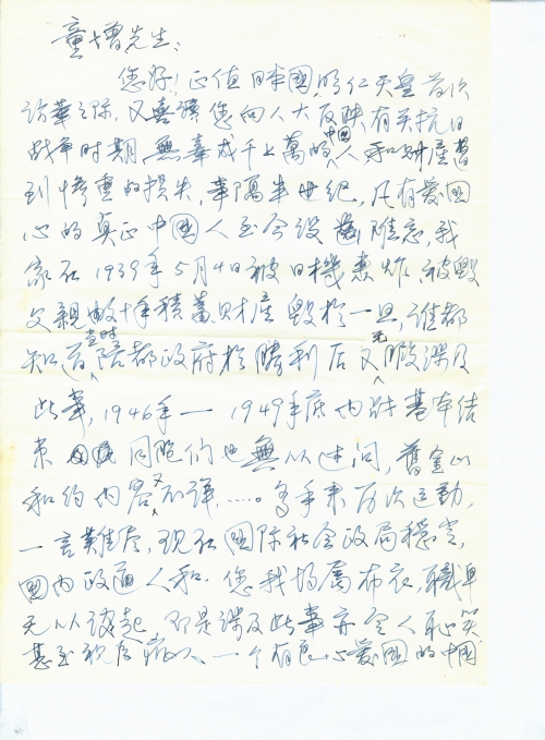 正值日本国明仁天皇首次访华之际,又喜读您向人大反映有关抗日战争时期无辜成千上万的中国人,和财产遭到惨重的损失,事隔半世纪,凡有爱国心的真正中国人至今没齿难忘,我家在1939年5月4日被日机轰炸,被毁父亲数十年积蓄,财产毁于一旦,谁都知道当时陪都政府于胜利后,又无暇涉及此事,1946年——1949年底内战基本结束,同胞们也无从过问,旧金山和约内容又不详……。多年来历次运动,一言难尽,现在国际社会政局稳定,国内政道人和,您我均属布衣,职卑无从谈起,即是涉及此事亦令人耻笑,甚至视为病人,一个有良心爱国的中国人,他想的是同胞的痛苦,而不是自己乌纱帽,和一个集团的私心,所谓:周公吐哺,天下归心,得民者昌,是也……等等,先天下之忧而忧,后天下之乐而乐的崇高情操,幸喜您是学国际法的,所谓“三人行必有我师焉。”能率先实践力行,甚为敬佩。不管此事成败与否,能有此良知,敢于向世人、统治者提出,[哪]怕您是普通庶民,这片爱国爱民赤诚良知,实属难能之可贵,吾有一愚见:A每年8月15日或七月七日,自愿集会追悼抗日战争时期死难于日本军国主义铁蹄下死难的2000万中国军民,用三言两语后默哀三分钟解散。B在全国,特别是南京(南京大屠杀重庆轰炸)……发起签名索赔运动。