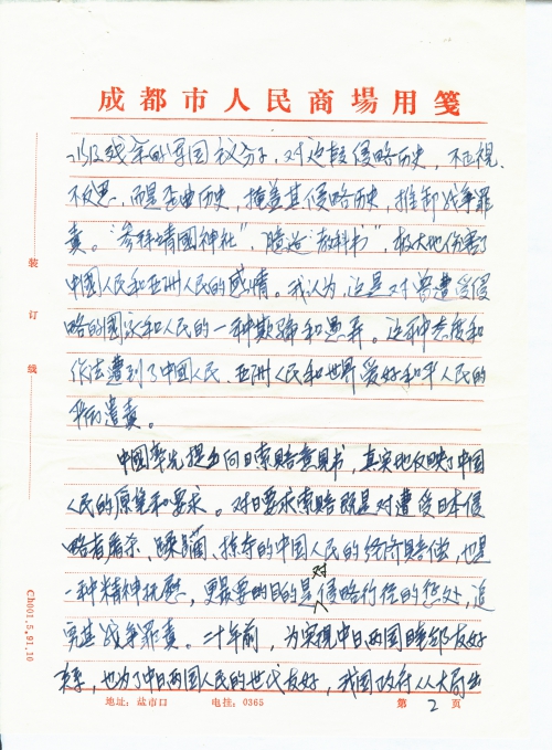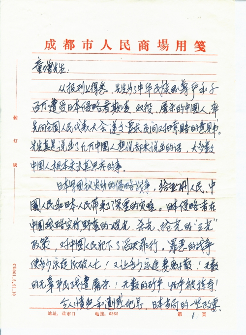 从报刊上得悉,先生为了中华民族的尊严和千百万遭受日本侵略者欺凌、奴役、屠杀的中国人,率先向全国人民代表大会递交要求民间对日索赔的意见书。先生真是说出了亿万中国人想说却未说出的话,大多数中国人根本未认真思考的事。