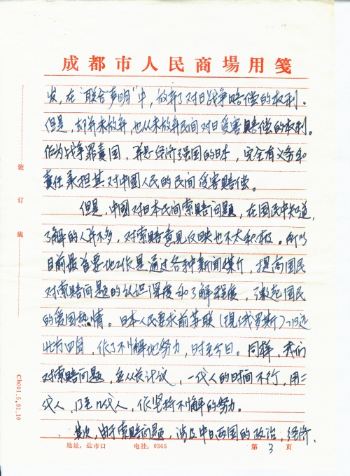 其次,由于索赔问题,涉及中日两国的政治、经济、文化各个领域,极其敏感。所以我国政府没有明确表示“联合声明”,是否放弃所有赔偿要求,留下了一个伸缩余地。我认为,我们应做好舆论宣传工作,把对日索赔意见上升为全民意识,并在一些[惨]遭日本侵略者屠杀、欺凌、奴役的地方([像]南京等地),召开对日索赔演讲会、同情会、赞成会等,打好基础工作,在条件成熟的情况下,成立民间对日索赔团体或组织,形成一种政治势力,促成政府能出面讲话,最终促成索赔成功。