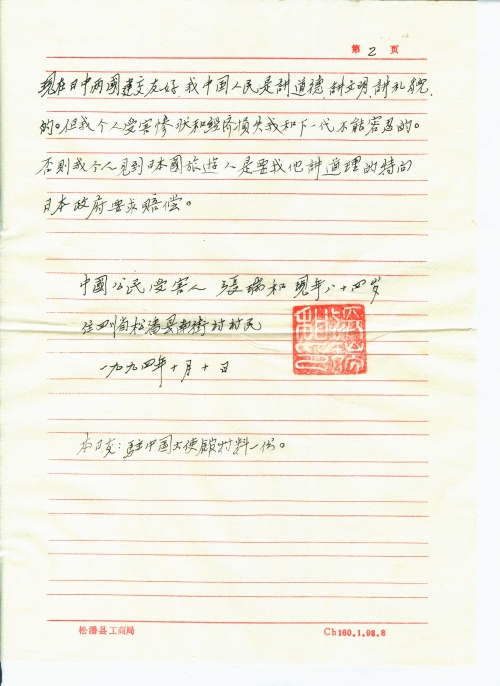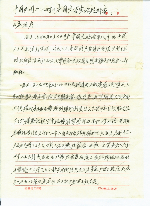 案由:在一九四〇年五月二十七日十一点钟时,那天我妻张王氏随带三岁小孩身带黄金二十两、活期存折一张,计数法币八万元到中街四川省银行办存取手续。刚到银行侧,突然27架日本飞机临空投下了炸弹数十枚,空中机枪射击,当时我妻和三岁小孩一并炸死,省银行被毁灭,全行工作人员及行长炸死,银行也片瓦无存,所有各户存取手续了之大吉。立刻火光四起、烟雾腾腾,全城一片哭声,丢下我和四岁小女立刻成了孤儿,四城门出丧,我本人在炸弹坑逃出好不凄惨。大火烧了五个钟头,中街烧光,火灭后寻找尸首已被烧成伕炭。这五十三年血海深仇再不能等候,再不能忍受。现在日中两国建交友好,我中国人民是讲道德、讲文明、讲礼貌的。但我个人受害惨状和经济损失,我和下一代不能容忍的。否则我个人见到日本国旅游人是要找他讲道理的,特向日本政府要求赔偿。