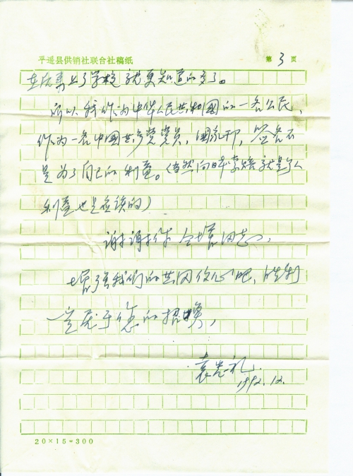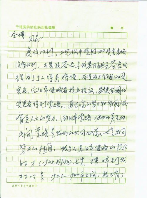 复信收到,上次信中提到邮受害表格没有收到,不[过]我签名与我妻阴迎兰签名均不是为了个人得点赔偿,而是为了全国的受害者,向日本侵略者提出抗议,并使全国的受害者得到索赔。通过你的努力和全国人民有关人士的努力,向日本索赔1800亿美元的民间索赔是我们的共同心愿,也是共同努力的目标。我个人在日本侵略的投[降]时才(1945.8.15)七岁,不过日本到我村时是1943—1944年之间,我已有了记忆,而且大人们在后来也经常告诉我们,我母亲现年86岁还在世,日本到我村掠走我家的财产,鲜蛋10余斤,上衣2件,鸡六只,这些东西在当时算一点损失,现在生活好了,我个人也不在乎了。