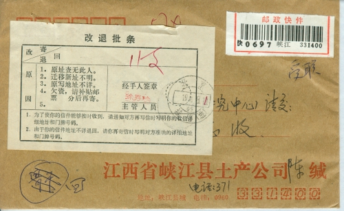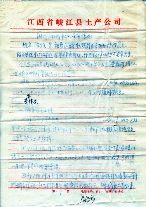 现住江西省峡江县土产公司职工宿舍二单元二楼10室,邮政编码:331400,电话号码:371,电报挂号:0960,有事请随时联系。