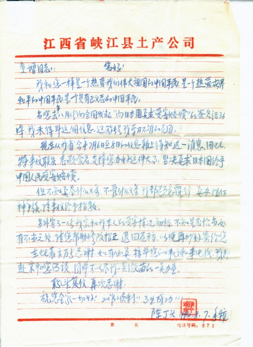 现在从我省今年7月6日至8日的信息报上得知这一消息,因此,特来信联系,志愿签名,支持您办好这件大事。坚决要求日本国给予中国人民受害赔偿。