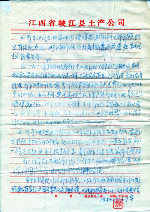 ⑥我哥哥也是在这次即一九四四年被日军抓去当挑夫的。直到日本投降才得放回吉安市。他从回家的途中病起,一直到家共病了一年多,无法起床,更无法去做事,真是被日本侵华者,害得走投无路。
