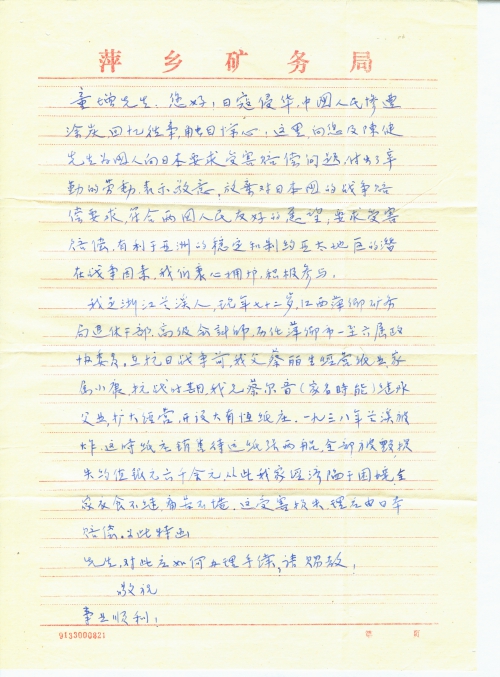 日寇侵华,中国人民惨遭涂炭,回忆往事,触目惊心。这里向您及陈健先生为国人向日本要求受害赔偿问题,付出了辛勤的劳动,表示敬意。放弃对日本国的战争赔偿要求,符合两国人民友好的愿望;要求受害赔偿,有利于亚洲的稳定和制约亚太地区的潜在战争因素,我们衷心拥护,积极参与。