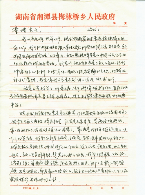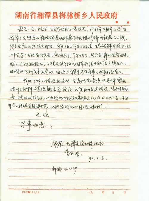 我叫李光明,现年30岁,现在湖南省湘潭县梅林桥乡政府工作。我在《湖南妇女报》第515期上刊登的周记者采访你关于中国民间对日“索赔”的文章后,方知曾被日本杀害的中国公民正在由你代理向日本政府索赔。我是一个被日本兵杀害了亲人的后代,很想伸张自己的权利,今特请你(委托)按有关国际法规,对日本政府进行索赔。我现将我父亲李运龙讲的情况概述如下: