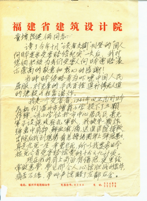 请您俩联合千千万万受害同胞,代为向日本索赔为盼,不胜感激之至。