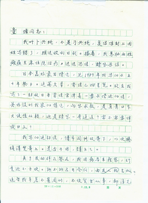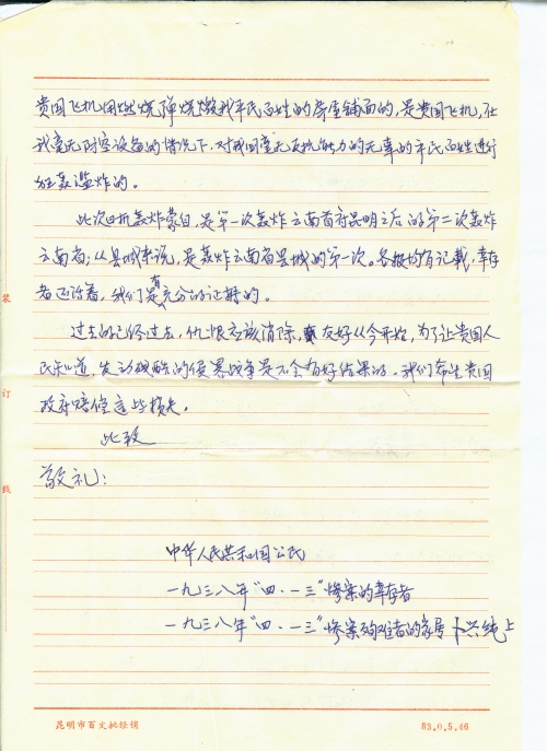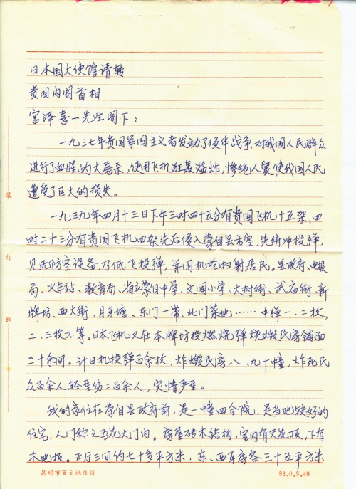 日本轰炸蒙自情况,见1989年我写的《五十年祭》。这篇文章,前信已附呈览。现在我写了一封致日本首[相]宫泽喜一要求偿还的信,具体谈到我家的情况,向您求教,是直寄日本大使馆收转,还是请您一齐递送?需不需要译成日文?
