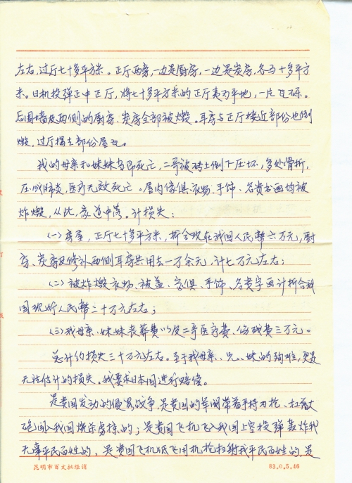 总计约损失三十万元左右。至于我母亲、兄、妹的殉难,更是无法估计的损失,我要求日本国进行赔偿。
