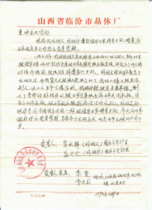In 1937, my grandfather An Yongxiang was a native of Banxia Village, Linfen City, in Shanxi Province. He was 34 in at the time. Grandfather was captured by the soldiers of Japanese Invasion Army Linfen Warehouse Garrison Troop to work as a slave laborer. Unable to withstand the inhuman treatment, he tried to escape but was captured afterwards and beaten to death. After grandfather died tragically, the whole family were unable make a living. My uncle was drafted by KMT, my little sister-in-law was sold to someone else, and the whereabouts of these two persons were still unknown today. My mother was sold as a child bride, leaving behind my ill-fated grandmother who was captured by the Japanese Army Warehouse to be a laundry worker. Because of a number of missing clothes, she was mauled to death by hounds released by the Japanese Army. My grandfather and grandmother were persecuted and grilled by the Japanese Invasion Army to death, just like many other compatriots in China in those years. Today we hereby file damage compensation from the Japanese government, which is fully justified, and consistent with the common wish of the Chinese nation.