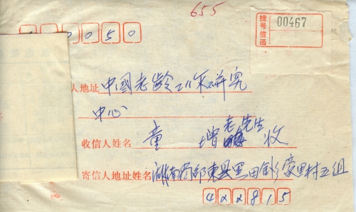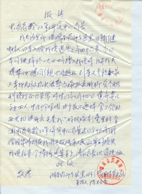 我夫许官成系湖南省邵东县黑田铺乡建中村人,日本入侵我境遇害之年四十六岁,当日本的铁蹄于一九四四年踏入我境时,我与我夫携带儿女随同乡亲四处避兵,到荣头弯亲叔家不幸我夫外出担水被警备队抓去挑脚,受尽酷刑拷打而后杀害,时值同年七月十四日,遗弃妻儿子女四人,生活十分艰难,由于衣不[蔽]体,食不饱肚,两儿相继死去,无奈我只好改嫁本乡豪里村。今闻中国老龄工作研究中心首长与日方协商赔偿侵华时期在我国无故残杀人民血案的损失。我现86岁,今特将此案呈上,请求首长以资抚恤。