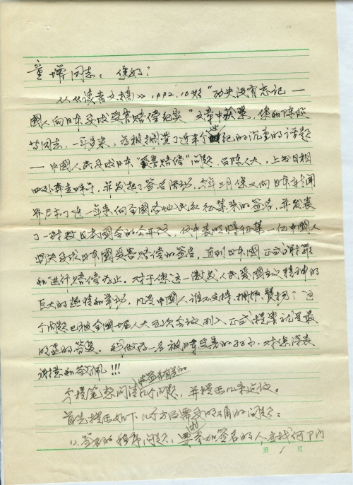 从《读者文摘》1992.10期“历史没有忘记——国人向日本要求受害赔偿纪实”文章中获悉,您和陈健等同志,一年多来,为被搁置了近半个世纪的沉重的话题——中国人民要求日本“受害赔偿”问题,面陈人大,上书日相,四处奔走呼号,并发起了签名活动。今年三月您又向日本新闻界展示了近一年来向全国各地民众征集来的签名,并发表了一封致日本国会的公开信,信中表明将征集一亿中国人坚决要求日本国受害赔偿的签名,直到日本国正式谢罪和进行赔偿为止。对于您这一激发人民爱国主义精神的巨大的热情和举动,凡是中国人谁不支持、拥护、赞扬?这个问题已被全国人大五次会议列入正式提案就是最明显的答复。我做为一名被日军受害的子孙,对您深表谢意和敬佩!