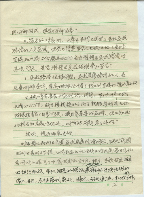 2、应设置相应的组织机构。在中国大地上,凡是过去日寇侵占过的地方,都有程度不同的各种受害者人群。建议在这些地方应设专门的临时机构,负责组织宣传、寻找受害人,受理有关索赔事宜等具体工作,一直到日本国正式谢罪,并进行赔偿完毕为止。为使各级有关部门引起重视,应由中央有关部门或用一定的形式下发文件,提出明确要求,并附上宣传提纲、索赔范围、对象、登记、签名的程序等一系列所需的具体规定等,以使这项工作有组织有领导,扎扎实实地开展下去。