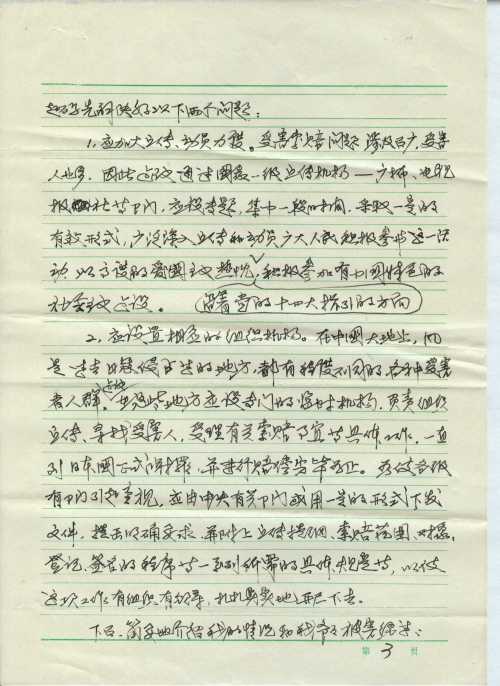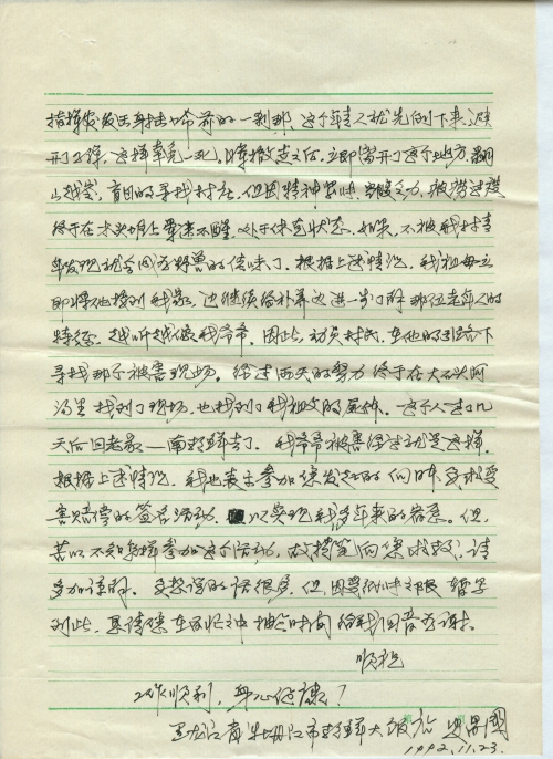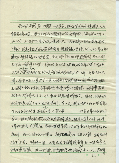 我叫安昌国,男,58周岁,中共党员,现任黑龙江省穆棱县人大常委会调研员。现在牡丹江市朝鲜大饭店帮忙。因幼年时期父母双亡,从五岁起在祖父母家长大。一九四五年八月初苏军进攻日军时,我家住在黑龙江省穆棱县穆棱镇三岔村。八月六日红军飞机轰炸穆棱镇的日军兵营,当天我村的30多户朝鲜族基本上都上徐家子铺避的难,我祖父和几位上岁数的老年人留下看护村庄。八月十五、六日,等村民都回村时,唯独我祖父不在,听一起留下的人讲:前些日子红军司令部来人,找到会俄语的我爷爷说通知上山避难的村民尽早回村,免遭日军的骚扰。我爷爷当天就上山找我们去了。但谁也没见到我祖父。因此,村民们动员起来找了几天也没找到。有一天,我的叔叔和几位青年人,在小石头河沟里发现了一名不省人事的穿日军内衣的年青人,拉到家抢救几天后才苏醒过来。据这个年青人讲,他是日军的逃兵,朝鲜族。当他脱掉军装顺大道想找朝鲜族村庄时,在一个汤口的小道上,被埋[伏]的日兵抓获。被拉到沟里边去。到那一看,已有六名朝鲜族青年和一位老年人被日寇看管。他一到那,日军就集体枪杀了这八人。当日军指挥官发出射击口令前的一刹那,这个年青人就先倒下来,避开了子弹,这样幸免一死。日军撤走之后,立即离开了这个地方。翻山越岭,盲目的寻找村庄,但因精神紧张,空腹乏力,疲劳过度,终于在木头堆上昏迷不醒,处于休克状态。如果不被我村青年发现就会成为野兽的佳味了。根据上述情况,我祖母立即将他接到我家,边继续给补养边进一步了解那位老年人的特征,越听越像我爷爷。因此,动员村民,在他的引路下寻找那个被害现场。经过两天的努力,终于在大石头河沟里找到了现场,也找到了我祖父的尸体。这个人过了几天后回老家——南朝鲜去了。我爷爷被害经过就是这样。根据上述情况,我也表示参加您发起的向日本要求受害赔偿的签名活动,以实现我多年来的[夙]愿。但,苦以不知怎样参加这个活动,故提笔向您求教,请多加谅解。要想说的话很多,但因受纸张之限,暂写到此,恳请您在百忙之中抽点时间,给我回音为谢。