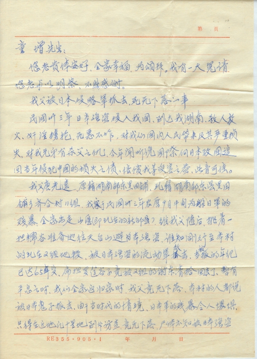 我父唐光远,原籍湖南邵东黑田铺,现籍湖南邵东县黑田铺乡齐合村11组。我家于民国三十三年农历9月中旬为躲日军的残暴,全家出走山区(即现在的新邵县),[唯]我父随后,挑着一担糯谷准备逃往天台山避日本强盗,谁知刚行至本村的现在2组地段,被日本强盗的流动军抓去,当被抓的年纪已达65岁。扁担[箩]筐谷子竟被2组的谢东清拾回去了,暂有平息之时,我们全家返归家时,我父竟无下落。本村的人都说被日本鬼子抓去,由于当时代的情境,日本军的残暴令人畏惧,只得在近地几十里地到处访查,竟无下落,尸体不知被日本强盗活埋、烧掉等等的残暴行为不明处置。对我父的哀愁全家刻记于怀,直至至今。今闻日本国能负[赔]偿损失之资,请拜托[予]以办理我父被害之损失之金,以我等对父的[重]新为追悼之责,以完余念。特此谨请,以求明察解决,余不多述,就此停诉。