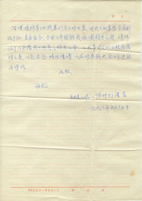 民国三十三年,日本强盗侵入我国,到达我湖南,杀人放火,奸淫掳掠,无恶不作,对我们国内人民带来[极]其严重损失,对我兄弟有杀父之仇。今年闻听说国际向日本敌国追回当年侵犯中国的损失之债,赔偿我等受害之益,此音可佳。