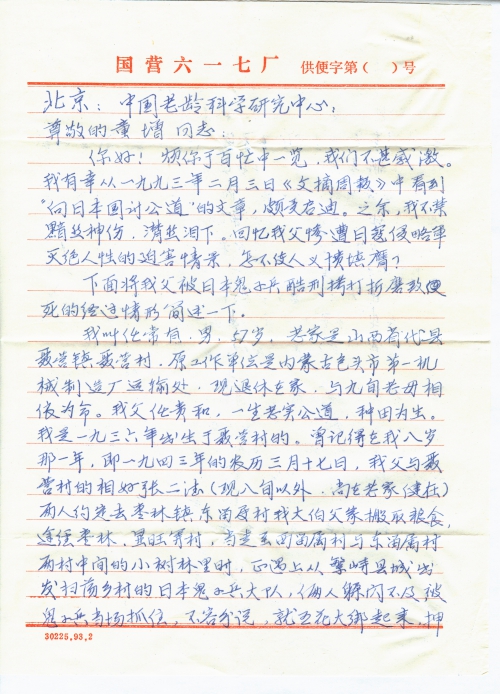 烦你于百忙中一览,我们不甚感激。我有幸从一九九三年二月三日《文摘周报》中看到“向日本国讨公道”的文章,颇受启迪。之余,我不禁黯然神伤,潸然泪下。回忆我父惨遭日寇侵略军灭绝人性的迫害情景,怎不使人义愤填膺?