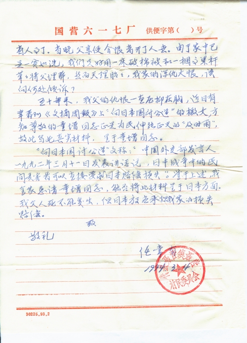 “向日本国讨公道”文称:“中国外交部发言人一九九二年三月十一日发表讲话说,日中战争中的民间受害者可以直接要求日本赔偿损失”。鉴于上述,我全家恳请童增同志,能否将此材料呈于日本方面。我父人死不能复生,但日本方面应承担我家的损失赔偿。