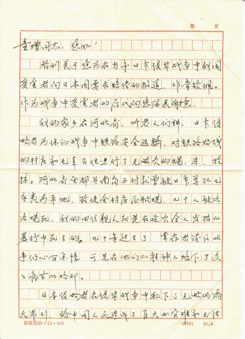 看到关于您为在当年日本侵华战争中我国受害者向日本国要求赔偿的报道,非常钦佩。作为战争中受害者的后代向您深表谢意。