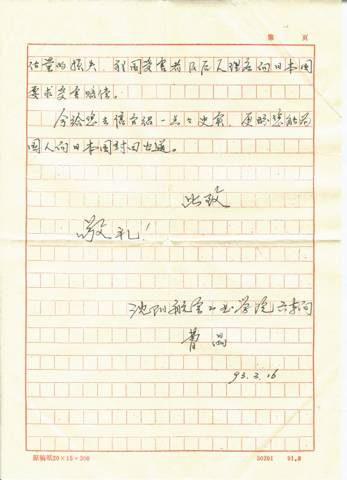 今给您去信介绍一点点史实,更盼您能为国人向日本国讨回公道。