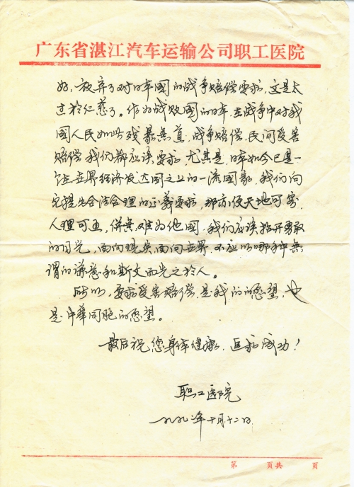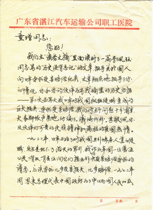 我们在“读者文摘”里面读到了一篇李佩钰同志写的“历史没有忘记”的文章,报导关于国人向日本要求受害赔偿纪实,文章翔实地报导了你的情况,你和你的伙伴为寻找确凿的历史证据——第二次世界大战日本对我国疯狂侵略造成的巨大损失,要求受害赔偿,我们对这个问题十分看重,大家都很严肃地讨论了。议论纷纷。甚敬佩你及伙伴们可贵的民族精神和满腔的爱国热情。