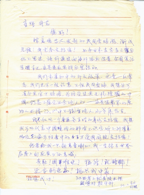 惊悉您等人发起的民间索赔潮渐成气候!我完全支持您!如今日本在前车之覆后仍不思过,强行通过向海外派兵法案,企图复活军国主义,这是违反其战后宪法的。