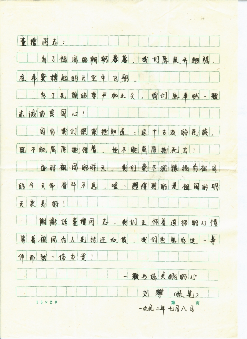 细节:谢谢你童增同志,我们也原为这一事贡献一份力量。信中寄来长丰县一中高二刘攀同学等几十人人的支持对日索赔签名。