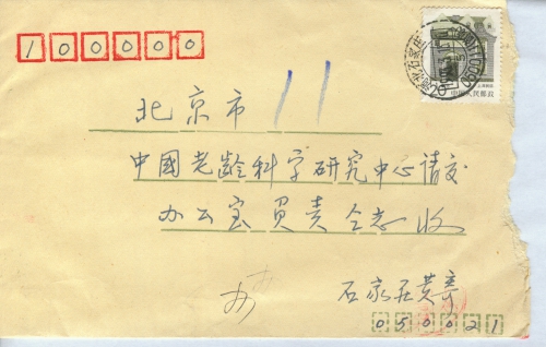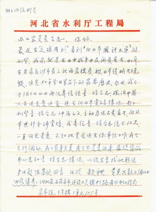 回信请寄:河北省石家庄市建设大厅槐中之路省水利工程局家属院3号楼1单元105号