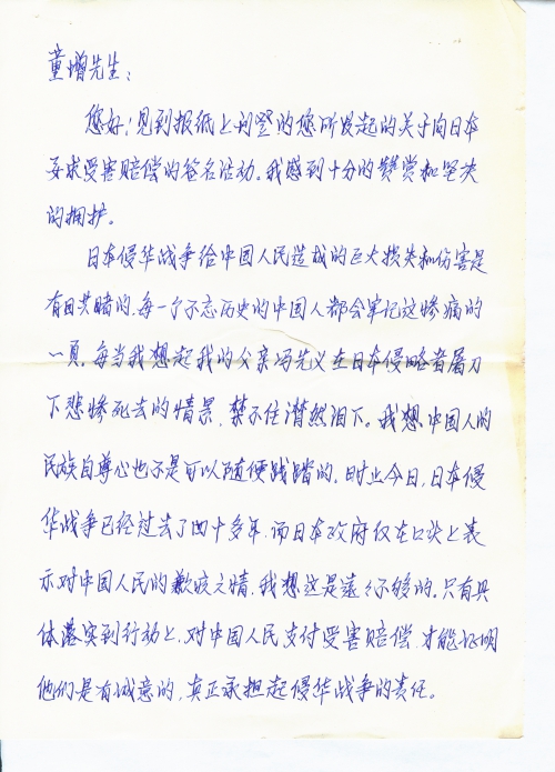 [作]为一名被日本侵略者杀害之死的家属,我为您童先生的正义行动所感动。您是在为中国人而做的一件大好事,也许您并不图什么,但我想谢谢您,并祝愿您事业蓬勃。