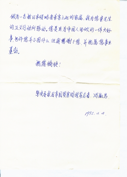 日本侵华战争给中国人民造成的巨大损失和伤害是有目共睹的。每一个不忘历史的中国人都会牢记这惨痛的一页。每当我想起我的父亲冯先义在日本侵略者屠刀下悲惨死去的情景,禁不住潸然泪下。我想中国人的民族自尊心也不是可以随便践踏的。时[至]今日,日本侵华战争已经过去了四十多年,而日本政府仅在口头上表示对中国人民的歉疚之情,我想这是远远不够的。只有具体落实到行动上,对中国人民支付受害赔偿,才能证明他们是有诚意的,真正承担起侵华战争的责任。