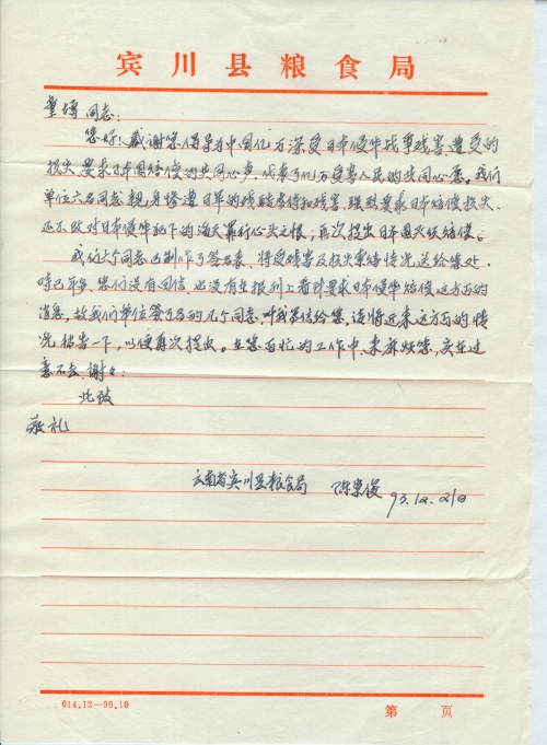 我们六个同志已制作了签名表,将受残害及损失索赔情况送给您处。时已年多,您们没有回信,也没有在报刊上看到要求日本侵华赔偿这方面的消息,故我们单位签了名的几个同志,叫我写信给您,请将近来这方面的情况转告一下,以便再次提出。在您百忙的工作中,来麻烦您,实在过意不去。谢谢!