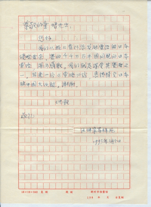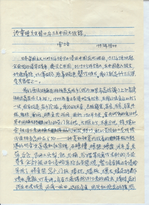 We learn from the newspaper that you have initiated a movement to demand compensation from Japan on behalf of the numerous Chinese people killed by the Japanese invaders. We are deeply grateful (for your efforts). We were also victims. Enclosed please find a Compensation Letter. Kindly please forward it to the Japanese embassy in China. Thank you.