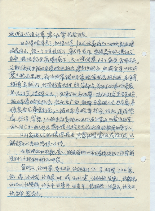 When the Japanese army came, my grandfather and a woman hid in a mountain behind Tangpowu and were discovered by a Japanese soldier. The solider intended to rape the woman, so he kicked my grandfather off the mountain and to Gaokan. My grandfather couldn’t urinate or defecate for 12 days and nights and died with hatred. My father, Ren Runsheng, was captured by the Japanese invading force and injured with bayonet. He became weak after that and died young. I myself, Ren Kunquan, was captured by the Japanese invading army to carry heavy stuff all night. I was hit when I walked a little slow and was injured in the face, chest and back. My grandfather’s younger brother, Ren Liangquan, was then 22 years old, just got married and worked as an assistant in the shop owned by his uncle Tan Binglin in Hengyang. He was captured by the invading Japanese troops and killed in Guangxi. His mother became a nun and his wife, Li Xingyuan, was widowed and lived alone for the rest of her life. My family members were killed and injured by the invading Japanese army, causing tragedy and sadness. It’s hard to measure our life by money. But the victims and their relatives should be compensated RMB 600,000 (calculated by the minimum value) for two members’ deaths and another two member’s injury.