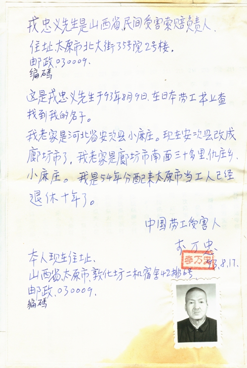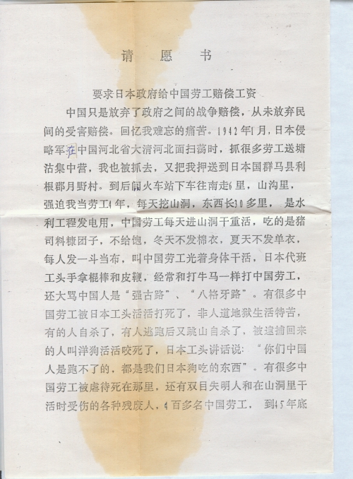 中国只是放弃了政府之间的战争赔偿,从未放弃民间的受害赔偿。回忆我难忘的痛苦。1942年1月,日本侵略军在中国河北省大清河北面扫荡时,抓很多劳工送塘沽集中营,我也被抓去,又把我押送到日本国群马县利根郡月野村。到后间火车站下车往南走6里,山沟里,强迫我当劳工4年,每天挖山洞,东西长30多里,是水利工程发电用,中国劳工每天进山洞干重活,吃的是猪[饲]料糠团子,不给饱,冬天不发棉衣,夏天不发单衣,每人发一[兜裆]布,叫中国劳工光着身体干活,日本代班工头手拿棍棒和皮鞭,经常和打牛马一样打中国劳工,还大骂中国人是“强古路”、“八格牙路”。有很多中国劳工被日本工头活活打死了,非人道地狱生活特苦,有的人自杀了,有人逃跑后又跳山自杀了,被逮捕回来的人叫洋狗活活咬死了,日本工头讲话说:“你们中国人是跑不了的,都是我们日本狗吃的东西”。有很多中国劳工被虐待死在那里,还有双目失明人和在山洞里干活时受伤的各种残废人,4百多名中国劳工,到45年底日本投降时,活下来的还有130多人。46年3月在美军帮助下回到祖国青岛市,红十字会接受我们的。详情面谈。