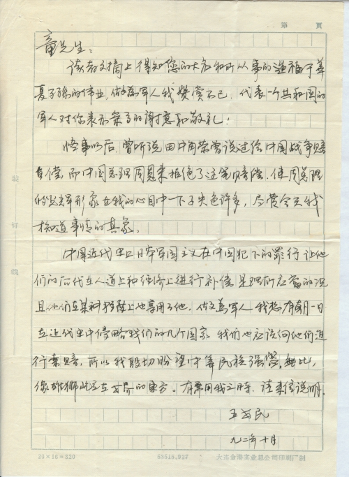 中国近代史上日本军国主义在中国犯下的罪行让他们的后代在人道上和经济上进行补偿是理所应当的,况且他们在某种程度上也享用了他。[作]为军人,我想有朝一日在近代史上侵略我们的几个国家,我们也应该向他们进行索赔,所以我殷切盼望中华民族强盛无比,像雄狮屹立在世界的东方。有需用我之时,请来信说明。