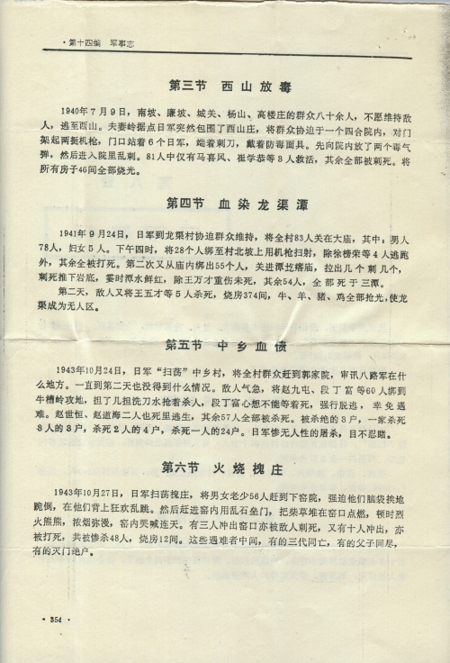 There were corpses all over the hills and valleys of Xihe, Guzhen, Chenlianggou and Shijiashan. 240 people were killed, 1,700 houses were burned down and all grain and livestock were robbed away.