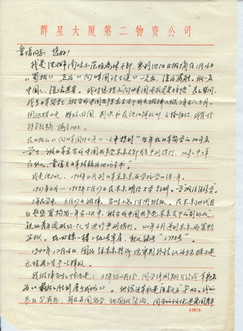 细节:我是日本留学生,在1939年5月27日被当做共产党员被抓入狱三年八个月,期间遭严刑拷打,1940年12月26日被释放。备注:信封丢失