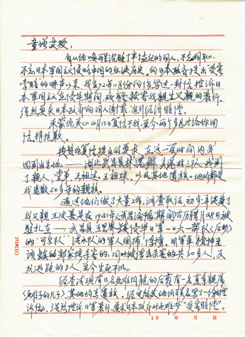 自从你唤醒沉睡了半个世纪的国人:不忘国耻,不忘日本军国主义侵略中国的血泪历史。向日本政府提出“受害索赔”的呼声以来。我在92年11月份向你写过一封信,控诉日本军国主义在侵华期间,残酷杀害我亲生父亲的暴行。强烈要求日本政府向国人谢罪,进行经济赔偿。