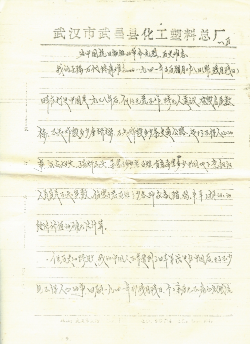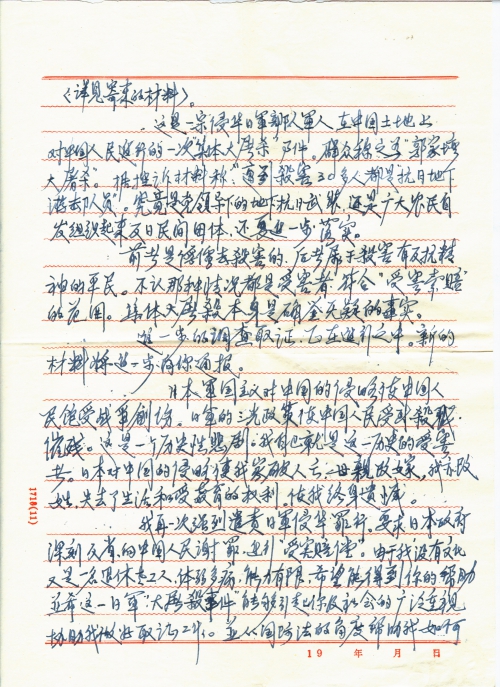 细节:按照你的复信提出的要求,我到出生地湖北省武昌县了解日军侵华罪行。我父亲王皮善等30多人在1941年被日军俘虏,并被杀死。后来母亲改嫁我也改姓。随信寄来受难者亲属的姓名。