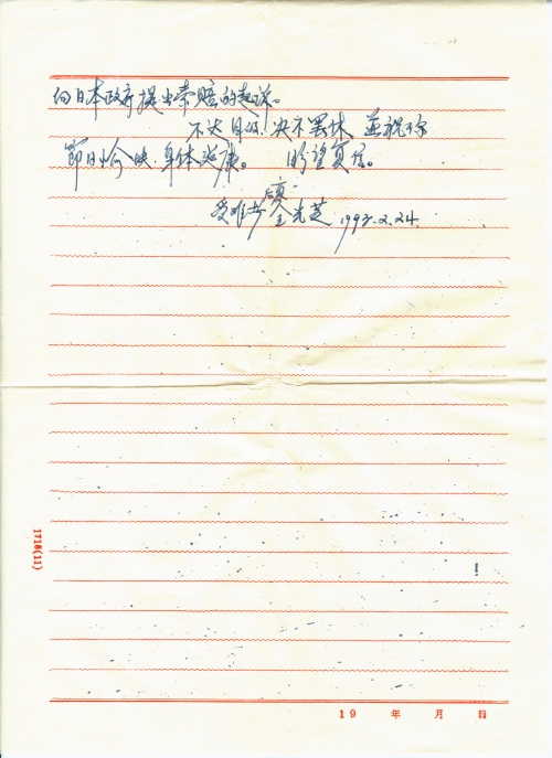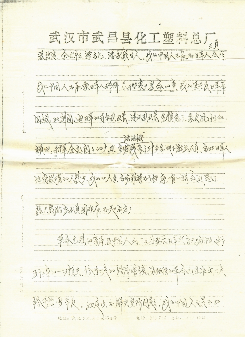 革命先烈的亲属及中国人民强烈要求日本政府天王领袖对前五十二年的一切损失,给予一定的经济赔偿,为牺牲的革命先烈壮士一定给予[昭]雪平反。如这次不解决实际问题,我们中国人民是不好欺辱的。中央的各位领导也不会轻易而主[动]放过日本对我们的侵略。我们下决心组织中国人民反对日本对我的国家十分的各种危害。