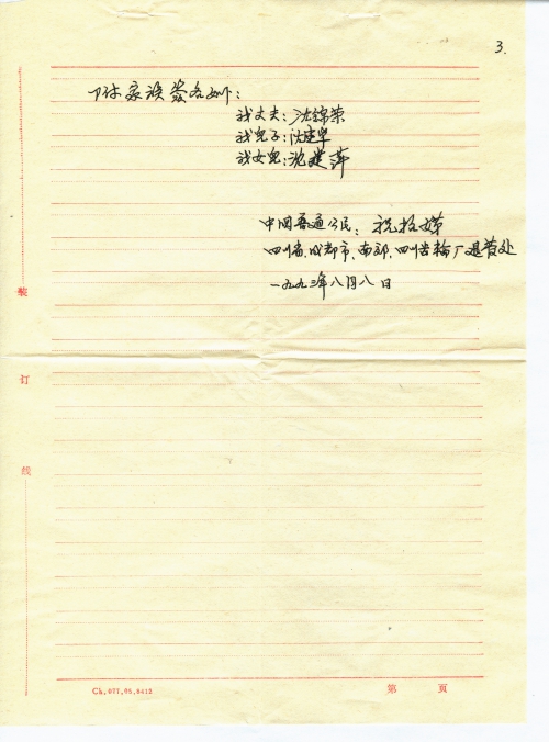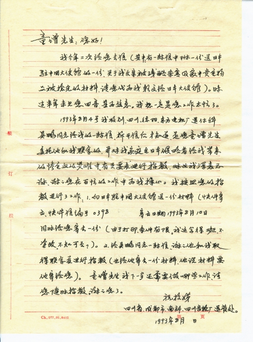 1993年8月4日我收到四川德阳东方电机厂退休科吴鹏同志给我的一封信,拆开信后才知道,是您童增先生委托他和我联系的,并对我家庭在日本侵略者给我带来的惨重血的灾难中,有关要求进行指教。对此我深表感谢,谢谢您在百忙的工作中为我操心。我按照您的指教进行了工作:1、向日本驻中国大使馆送一份材料(快件寄出,快件信编号0398 寄出日期:1993年8月10日),同时给您寄去一份(由于打印条件有限,我这字得[工整],不涂改,不知可否?)。2、给吴鹏同志一封信,谢谢他和我取得联系并进行指教(也给他寄去一份材料,他说材料要他寄给您)。童增先生,我下一步还需要做哪些工作?请您随时指教。谢谢您了。