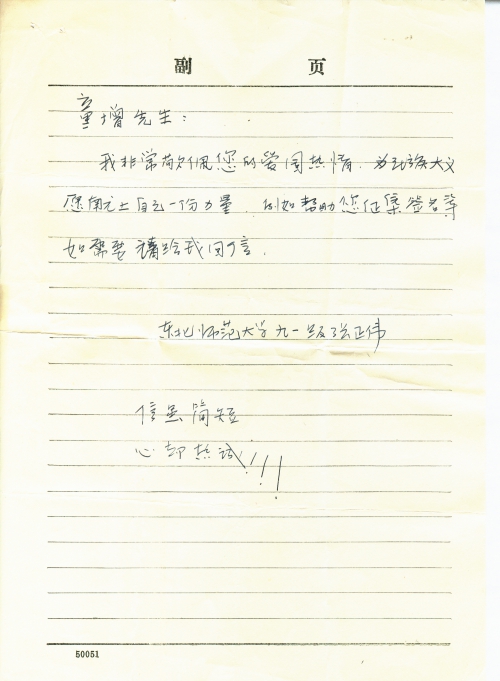 21 10 月, 2018 s1152 Share EmailTwitterFacebookGoogle +PinterestTumblrLinkedinVkontakte 信扫描序列号:s1152 写信日期:1992-10-18(信封日期) 写信地址:辽宁省沈阳市 受害日期:无 受害地址:无 写信人:张正伟 受害人:无 类别:其它(OT) 细节:我佩服您的爱国热情,如需要我做的请回信。 童增先生: 我非常敬佩您的爱国热情,为民族大义愿献上自己一份力量。例如帮助您征集签名单,如需要请给我回信。 东北师范大学九一级 张正伟 信虽简短 心却热诚!!! 21 10 月, 2018 10000cfj_3o5som 其它(OT)