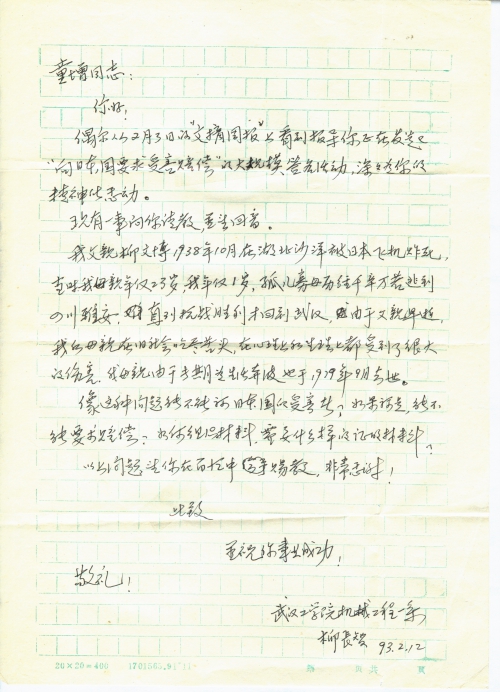我父亲柳文博1938年10月在湖北沙洋被日本飞机炸死,当时我母亲年仅23岁,我年仅1岁,孤儿寡母历经千辛万苦逃到四川雅安,直到抗战胜利才回到武汉,由于父亲早逝,我的母亲在旧社会吃尽苦头,在心理上和生活上都受到了很大的伤害。我母亲由于长期为生活奔波也于1979年9月去世。