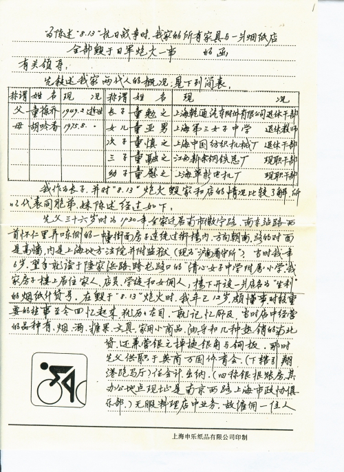 我作为长子,并对“8.13”炮火毁家和店的情况比较了解,所以代表同胞弟、妹陈述经过如下:
