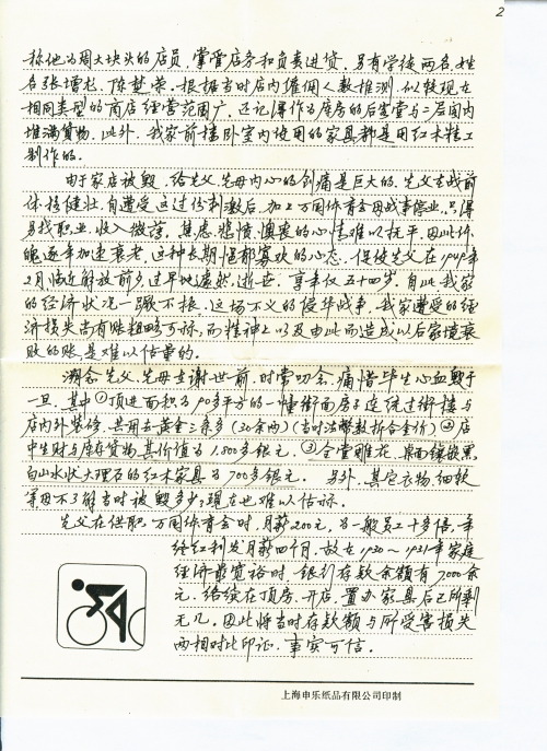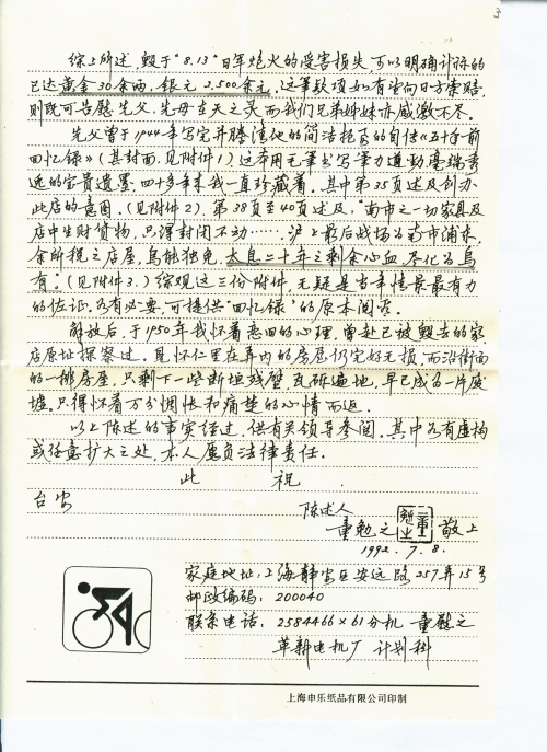 先父曾于1944年写完并滕清他的简洁扼要的自传《五十年前回忆录》(其封面,见附件1)。这本用毛笔书写笔力道劲,毫端秀逸的宝贵遗墨,四十多年来我一直珍藏着。其中第35页述及创办此店的意图。(见附件2)。第38页至40页述及:“南市之一切家具及店中生财货物,只得封闭不动……沪上最后战场为南市浦东,余所税之店屋,乌能独免,太息二十年之剩余心血,尽化为乌有。”(见附件3)综观这三份附件,无疑是当年情景最有利的佐证。如有必要,可提供“回忆录”的原本阅看。