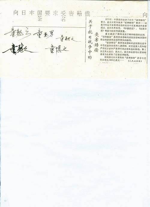 寄来的“复信”(1)复印件已收到。今将九•一八日本侵华时的受害者童勉之全家签名及家产损毁情况的书面复印件寄上供参考