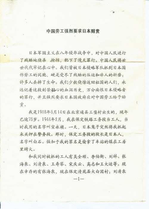 日本军国主义在八年侵华战争中,对中国人民进行了残酷地烧杀、抢掠,犯下了漫天罪行。中国人民将世世代代牢记在心中。我们曾被日本侵略军队抓到日本国作劳工的同胞,硬是受尽了残酷的压迫和非人的折磨;许多人丢掉了生命。我们少数侥[幸]返回祖国的人们,永远记着这段刻苦铭心的血泪历史,万分痛恨日本侵略者的罪行,并且强烈要求日本国政府应对中国劳工给予赔偿。